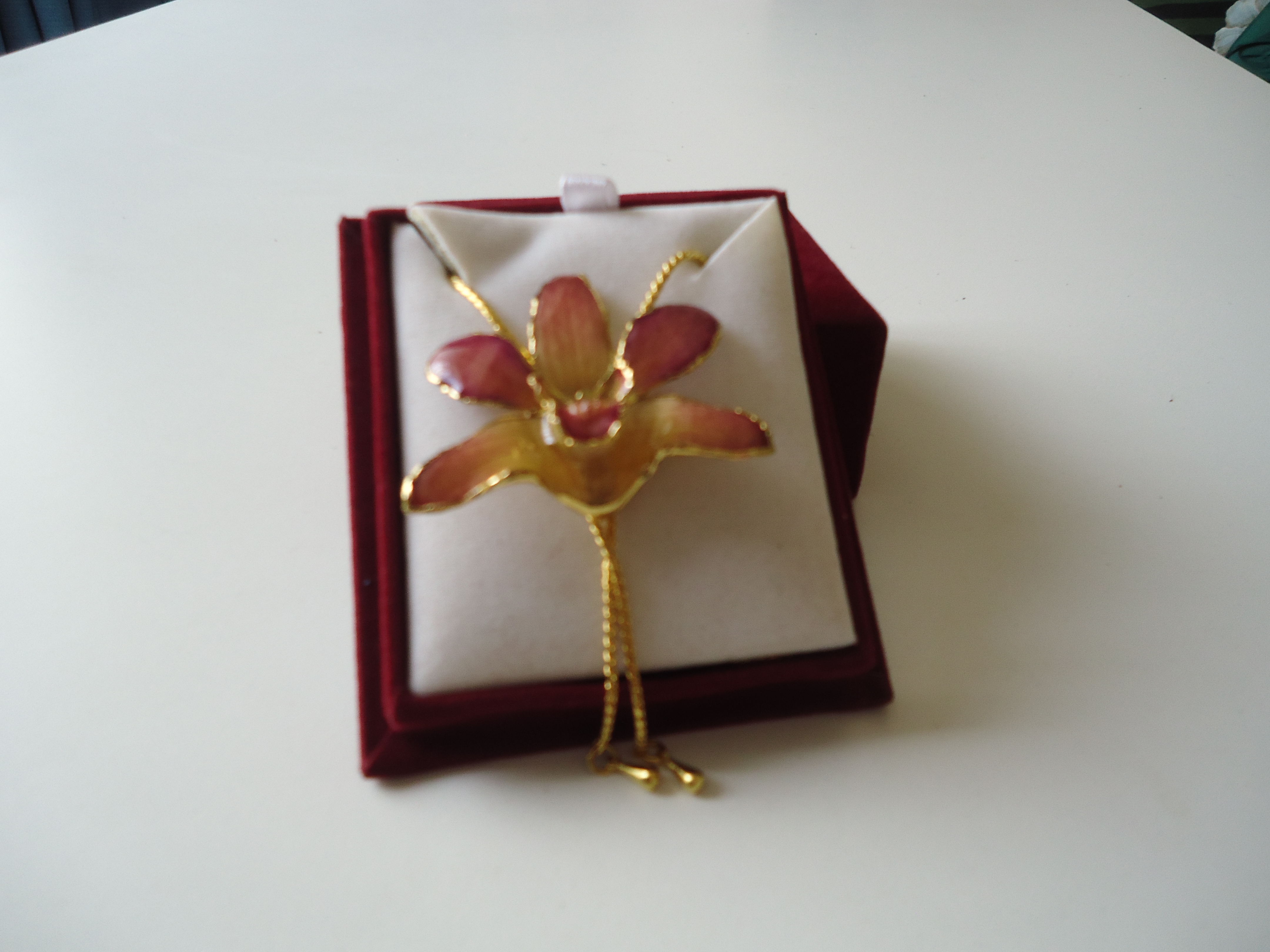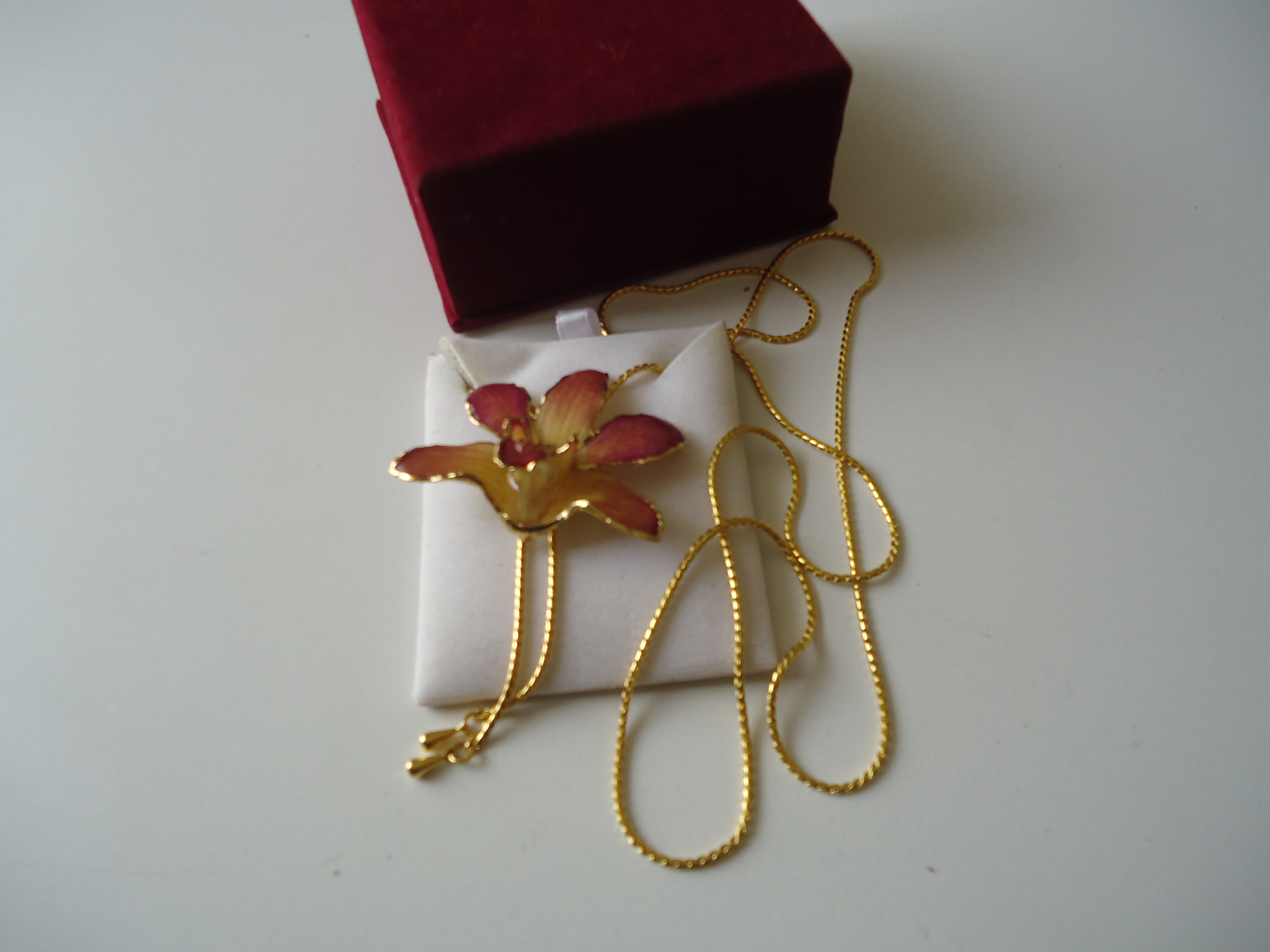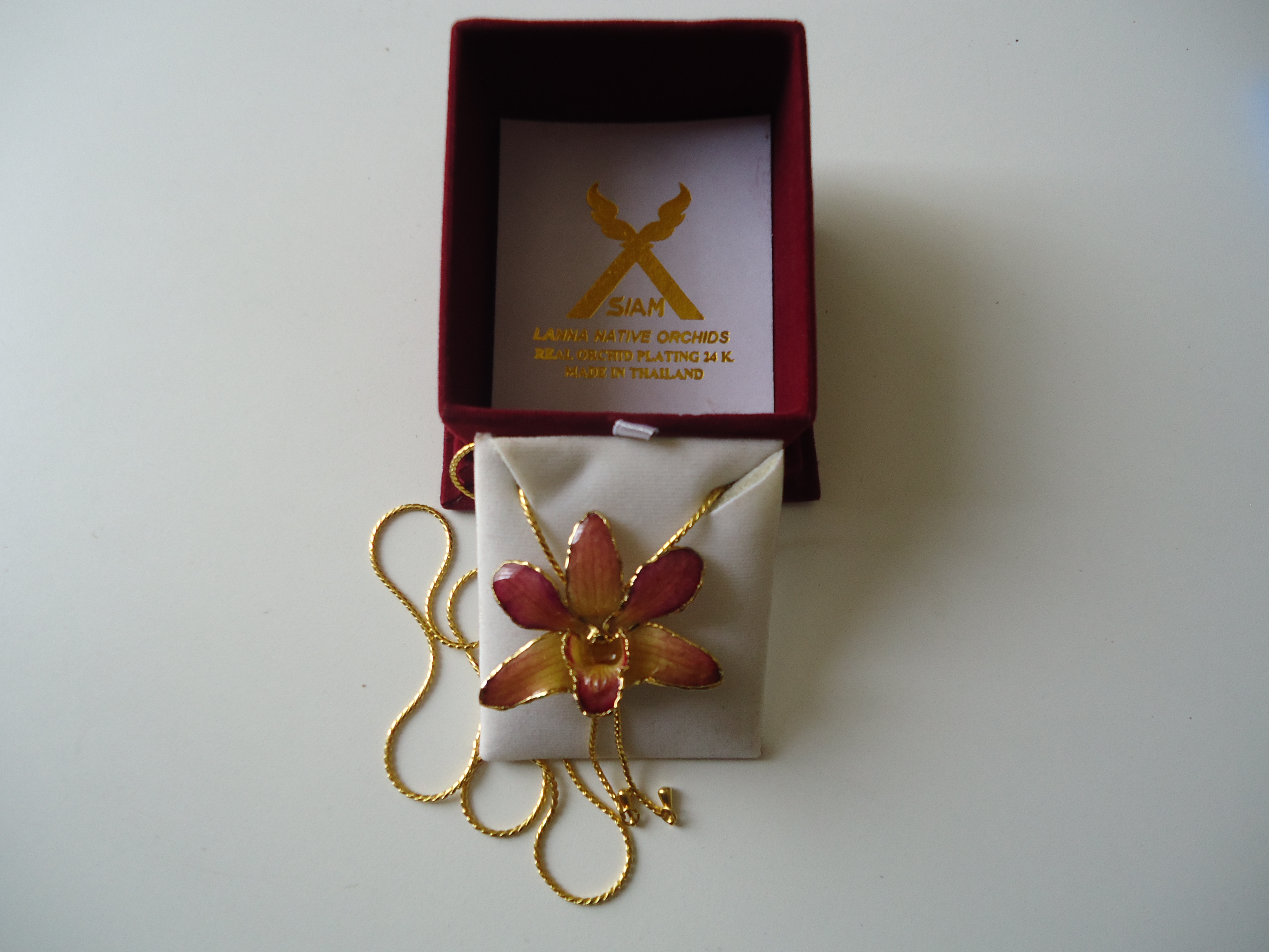 An elegant Penadent or Broach, A Siam Native orchard, encased in resin and edged in golden trim on a fine golden chain.