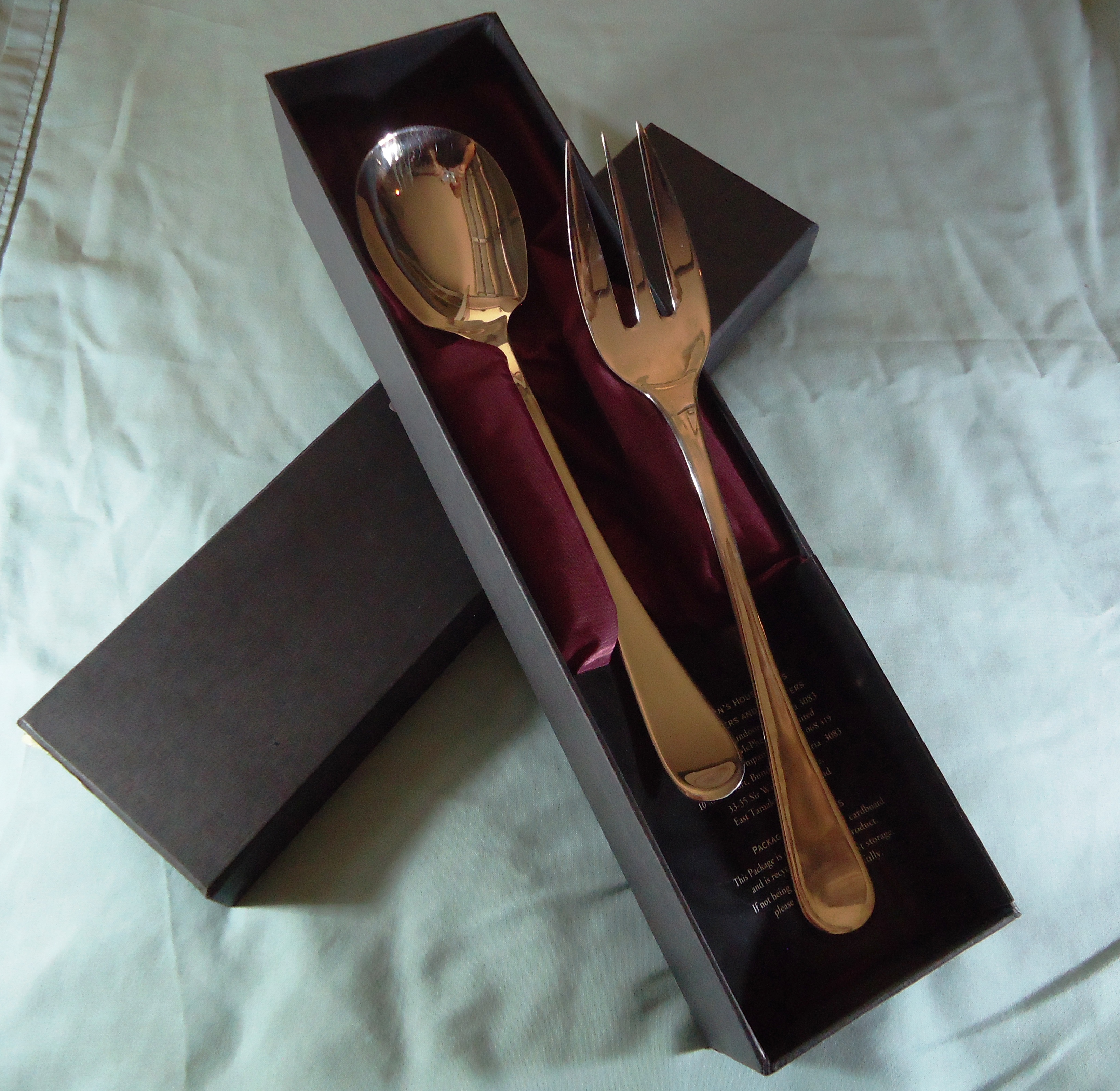 One near New set of Grovenor Serving Utensils. This Stainless Steel Fork & Spoon Set has been in storage for some time and is well traveled, but never used.
